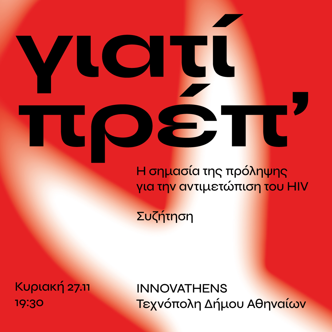 Η Τεχνόπολη Δήμου Αθηναίων σε συνεργασία με το Σύλλογο Οροθετικών Ελλάδος – Θετική Φωνή και την Ελληνική Εταιρεία Μελέτης και Αντιμετώπισης του AIDS (Ε.Ε.Μ.Α.Α.) διοργανώνουν, την Κυριακή 27 Νοεμβρίου, στις 19.30, την εκδήλωση «Γιατί πρέπ’. Η σημασία της πρόληψης για την αντιμετώπιση του HIV» στο κτίριο του INNOVATHENS στην Τεχνόπολη.