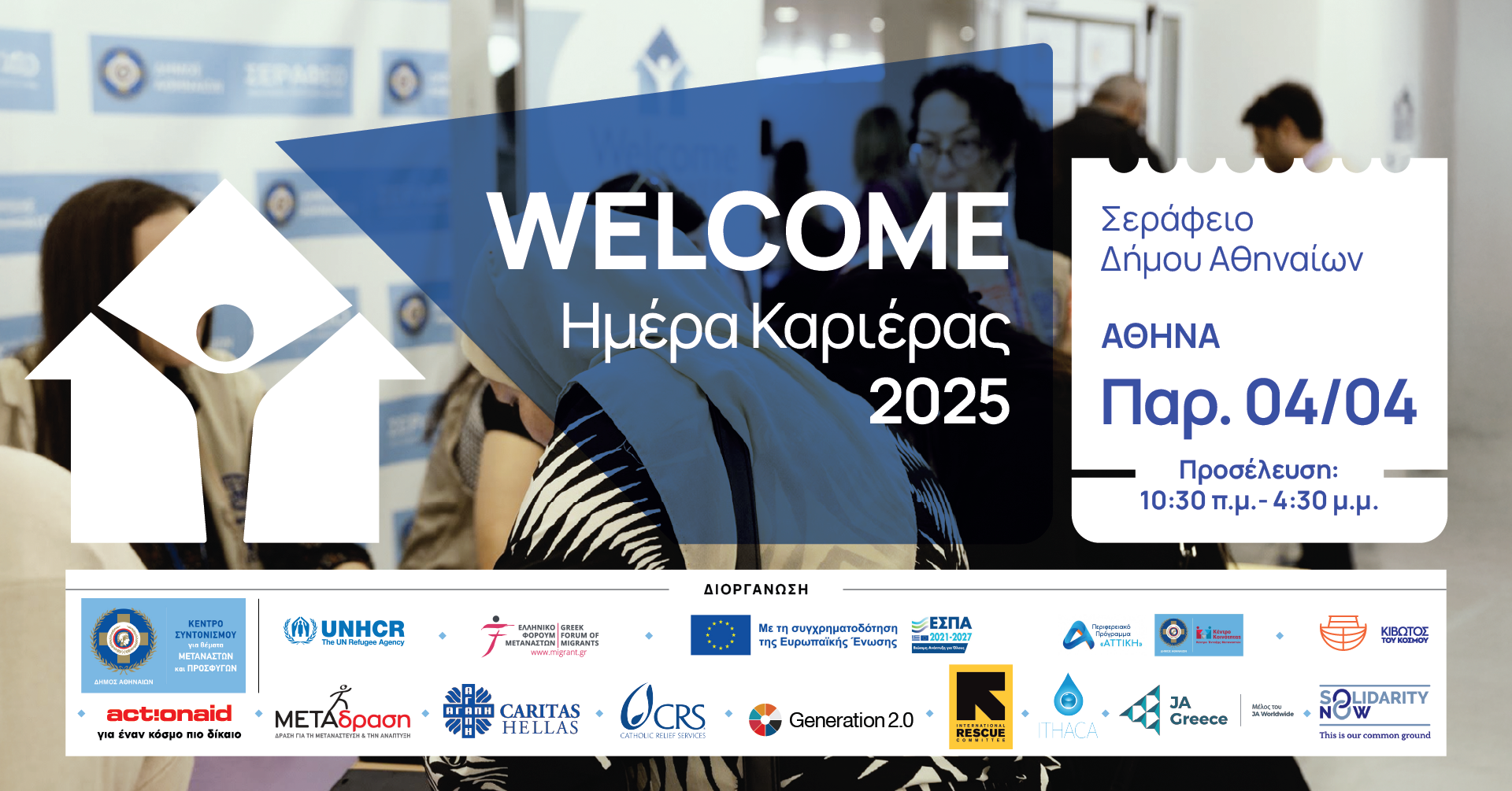 Το Κέντρο Συντονισμού για θέματα Μεταναστών και Προσφύγων Δήμου Αθηναίων | ACCMR σας καλεί στο «WELCOME 2025», που για 5η χρονιά προσφέρει ευκαιρίες απασχόλησης και δικτύωσης σε όλους και όλες χωρίς διακρίσεις, με έμφαση σε υποψηφίους με προσφυγικό και μεταναστευτικό υπόβαθρο.