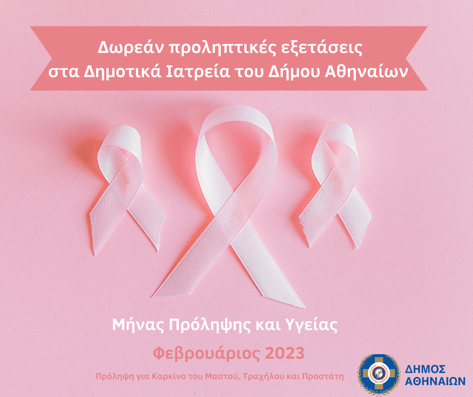Λαμβάνοντας μέρος στη διεθνή εκστρατεία πρόληψης και ενημέρωσης με στόχο την καταπολέμηση του καρκίνου, που αποτελεί και τη συχνότερη αιτία θανάτου μετά τις καρδιαγγειακές νόσους, ο Δήμος Αθηναίων δίνει αυτόν τον Φεβρουάριο τη δυνατότητα σε όσες και όσους επιθυμούν να προγραμματίσουν εξετάσεις, που ειδικά για τις γυναίκες αφορούν την πρόληψη του καρκίνου του μαστού και του τραχήλου και για τους άνδρες την πρόληψη του καρκίνου του προστάτη.