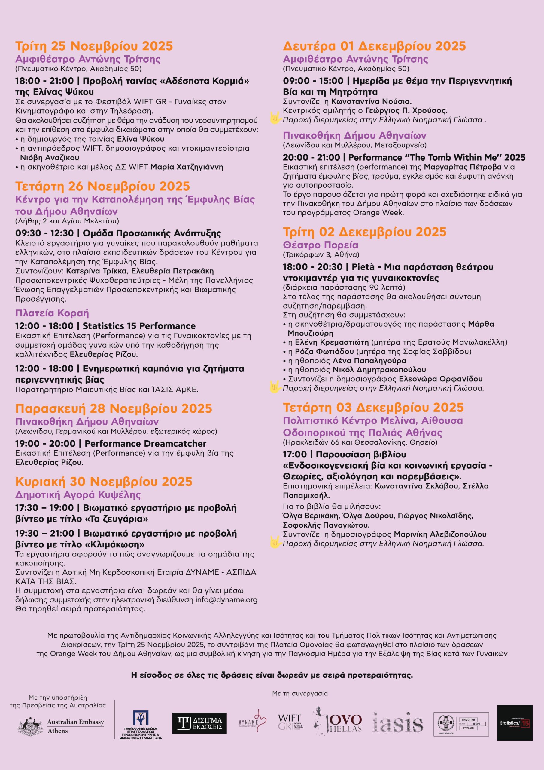 Η Πρόεδρος του Οργανισμού Πολιτισμού, Αθλητισμού και Νεολαίας Δήμου Αθηναίων, Ελένη Ζωντήρου, επισήμανε: «Με θεατρικές παραστάσεις, κινηματογραφικές προβολές, εικαστικές δημιουργίες, συζητήσεις και παρεμβάσεις ενημέρωσης, η πόλη μεταμορφώνεται σε έναν ανοιχτό χώρο ευαισθητοποίησης και συμμετοχής. Προσκαλούμε το κοινό να συνδεθεί, να ενημερωθεί και να συμβάλλει ενεργά στην προώθηση της ισότητας και στην εξάλειψη της βίας κατά των γυναικών».