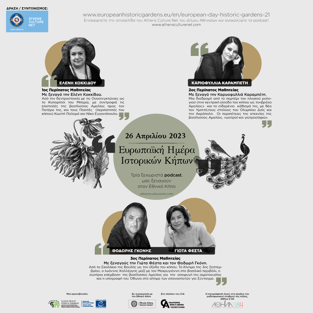 Μέσω τριών ξεχωριστών podcast,  περπατούμε μαζί τους ανάμεσα από τις προτομές των ποιητών , Διονύση Σολωμού, Αριστοτέλη Βαλαωρίτη, Ζαν Μορεάς, αλλά και του κυβερνήτη Ιωάννη Καποδίστρια ή του Ελβετού τραπεζίτη Εϋνάρδου, διασχίζοντας τα κηποτεχνικά επιτεύγματα του Φρανσουά Λουί Μπαρώ, και μαθαίνουμε  για τη φροντίδα και την αγάπη της απαγηρόρητης βασίλισσας Αμαλίας. Τα κείμενα βασίζονται στο βιβλίο των Θοδωρή Γκόνη και Ελένης Στρούλια, “Εθνικός Κήπος – Περίπατος Μαθητείας 20+1 στάσεις”,  (εκδόσεις Άγρα) . Μια πρωτοβουλία του Athens Culture Net του Δήμου Αθηναίων.